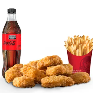 10 nuggets de pollo crujientes con acompañamiento mediano y bebida.