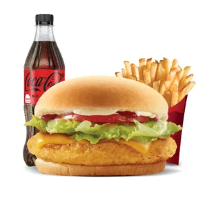 Sándwich de pollo crujiente, cheddar en feta, tomate, lechuga, ketchup y mayonesa en pan con acompañamiento mediano y bebida.